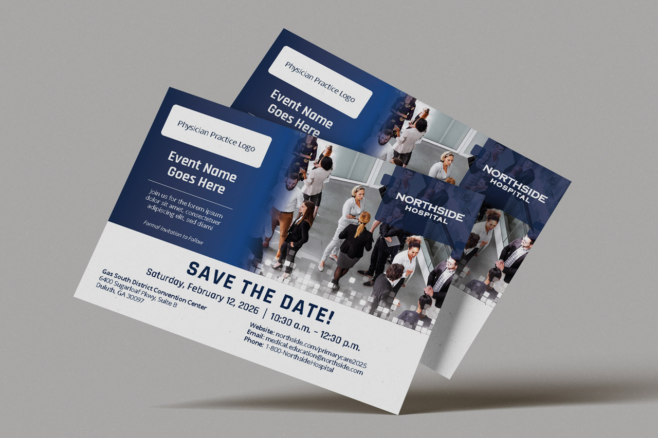 Northside Hospital needed to provide its vast network of doctors and practices with a user-friendly way to create professional-quality invitations, announcements, and postcards for their local events. We worked with their team and their brand guide to design a collection of templates that are attractive and easy for a non-designer to use on their DIY print-request platform.